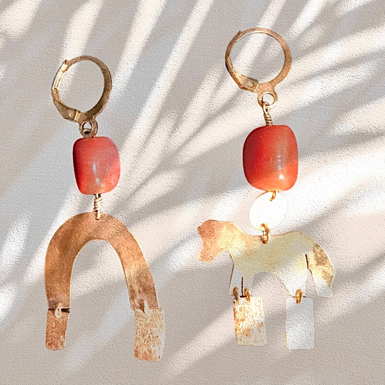 Boucles asymétriques plaquées or 24K 5 microns, Perle orange en céramique